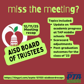 The 12/11 meeting covered academic progress at middle schools currently under TAPs (Burnet, Webb, and Dobie), adjustments to the district scorecard, and the college, career, and military destinations of the 2023 AISD graduates. The Board will meet next for a voting meeting on 12/18.
